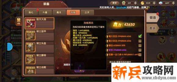洗练属性需要先知道自己要什么属性,每个装备有7条固定属性,自己选择最适合自己的5条即可,看自己是走pvp还是pve方向去洗练;每个装备的7条固定属性在洗练界面右下角点击洗练预览即可看见,如武器的洗练预览见下图3-1;一般洗练10次即可出现一次MAX属性,有实力的可以直接洗练到自己想要的属性MAX为止。