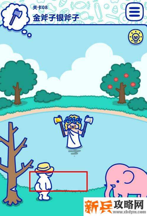1.点击获取右边树上的第三个苹果,把苹果丢进白狗狗身前位置的水里;