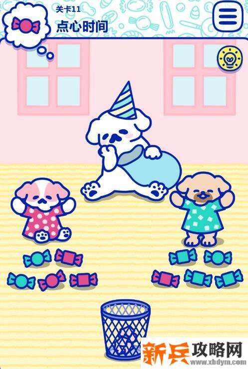 这关就是分糖果,分糖果把糖果拖到它们身上就行,两只狗都是五颗糖,不用区分颜色,注意掏出来的纸要拖进垃圾桶里。
