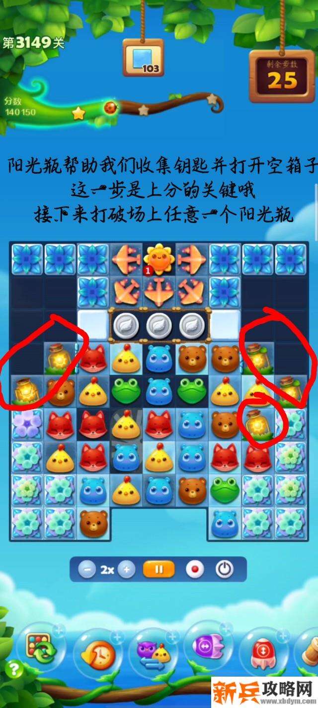 1.打破三个阳光瓶子收集🔑,开空箱子(容易制造连消爆分)。