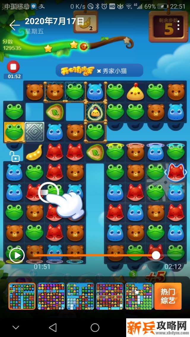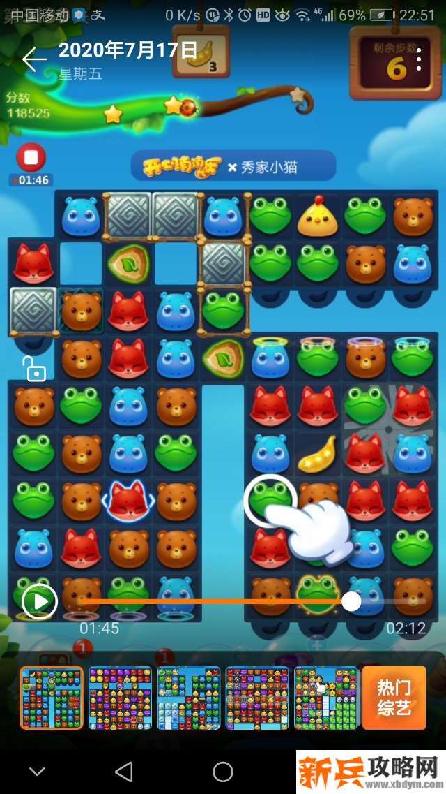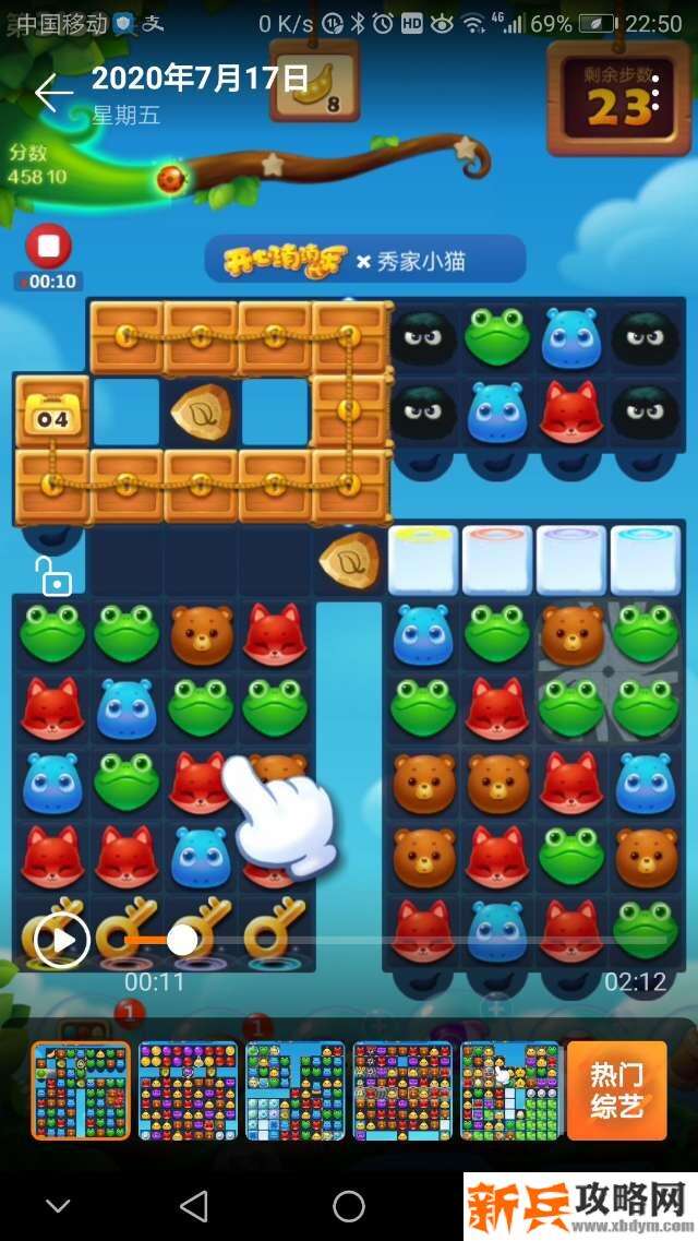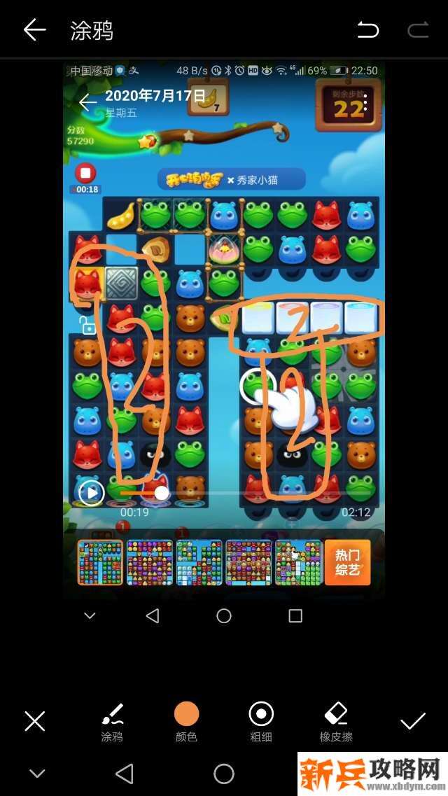 (2)在右边消冰块打通金豆子回家的路!当金豆子左上角时打爆魔石,让金豆子下来吧,来到石门处,打左下角让它离开石门!就到右边打就可以了!