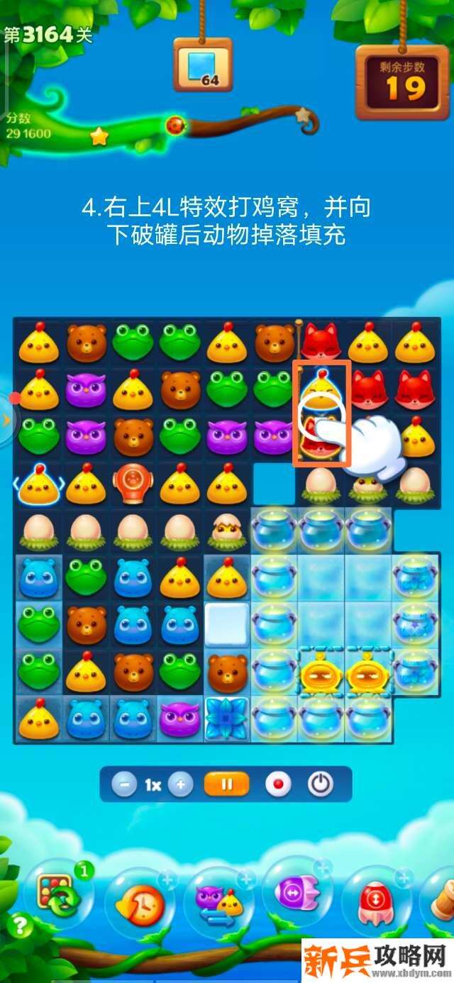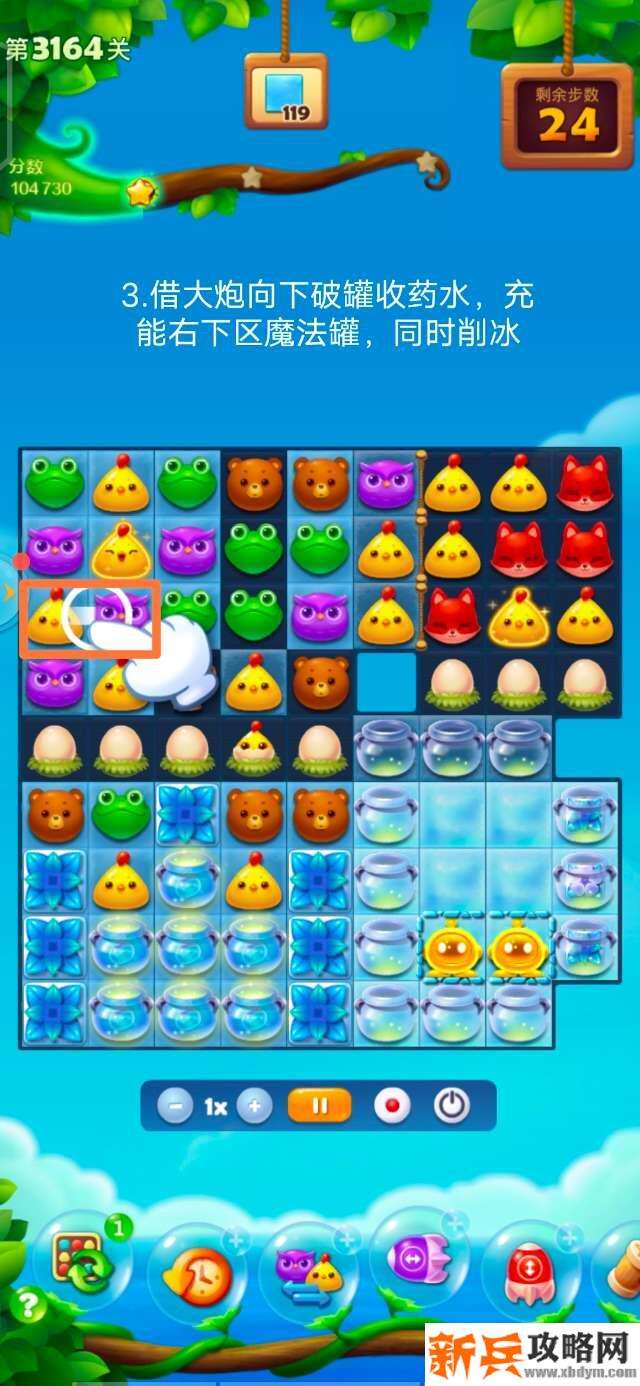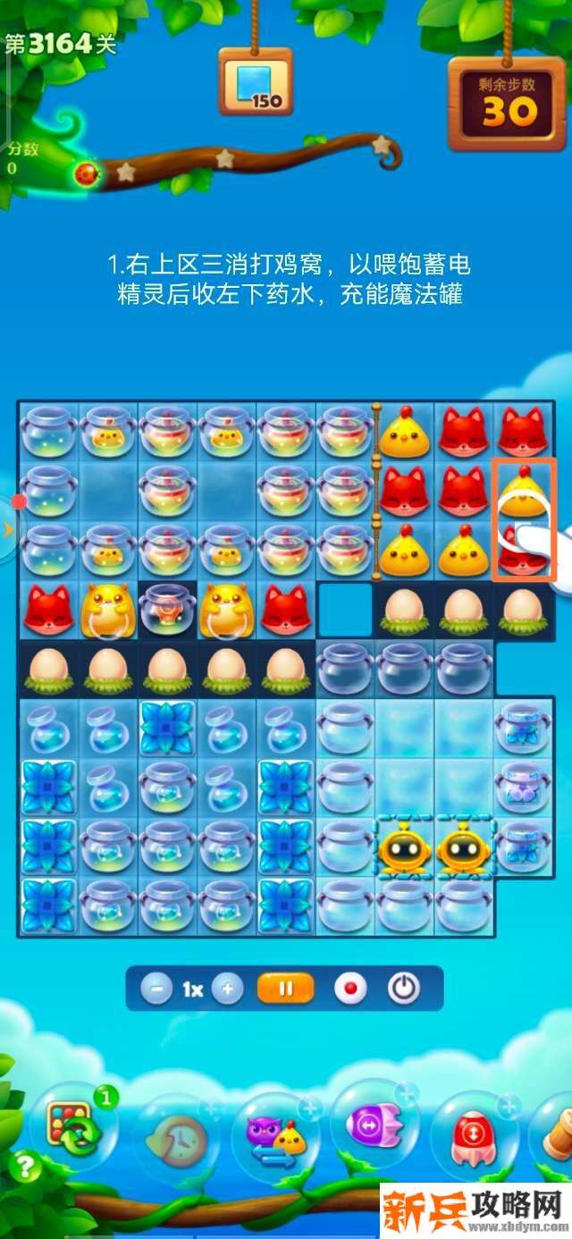 1.右上区三消打鸡窝,以喂饱蓄电精灵释放后,收集左下区魔法药水,充能魔法罐;