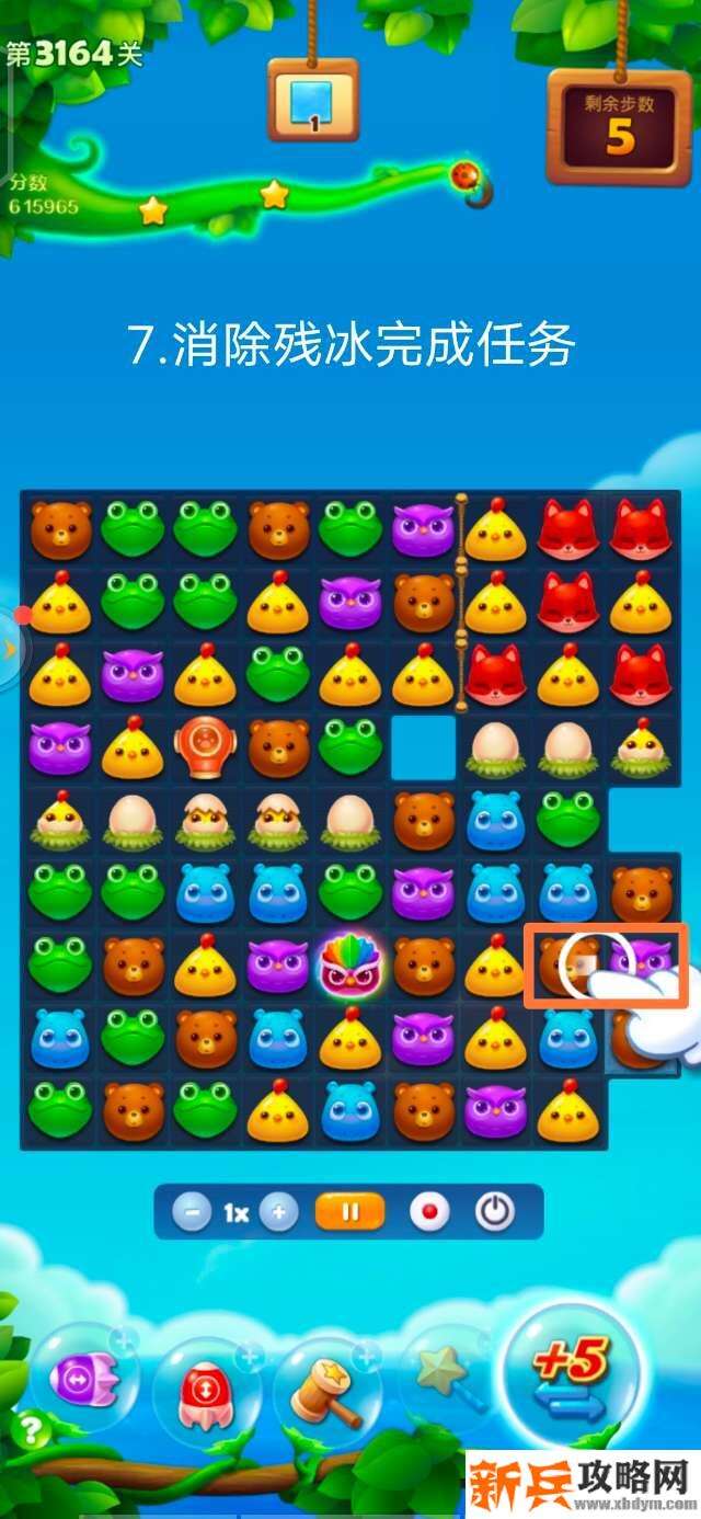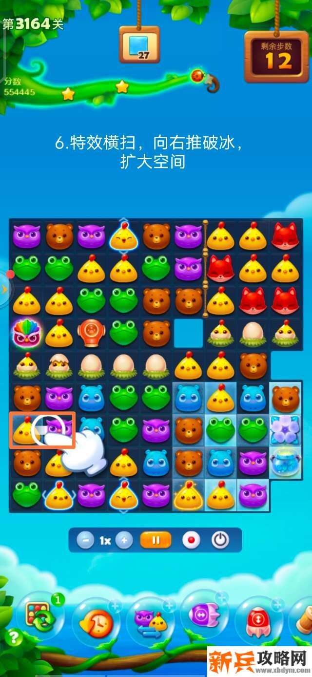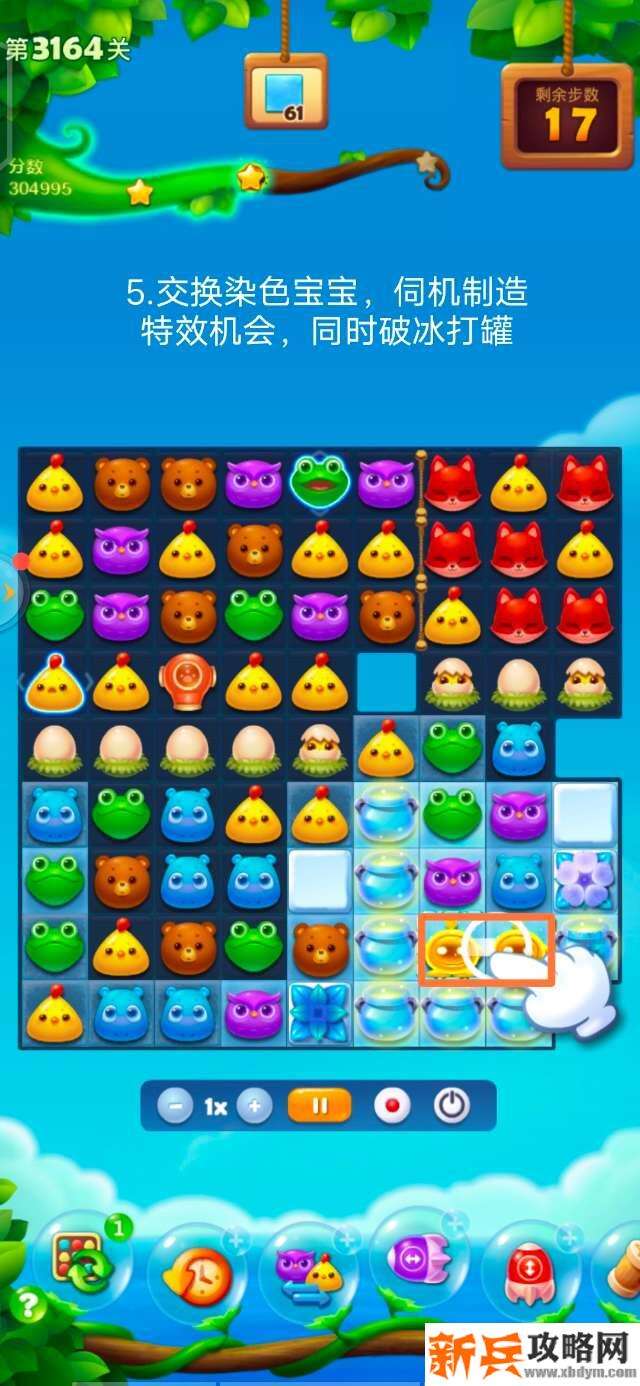 4.此后可在上部组竖直特效,左消冰块右打罐,清除右下区障碍,为染色宝宝交换创造条件;
