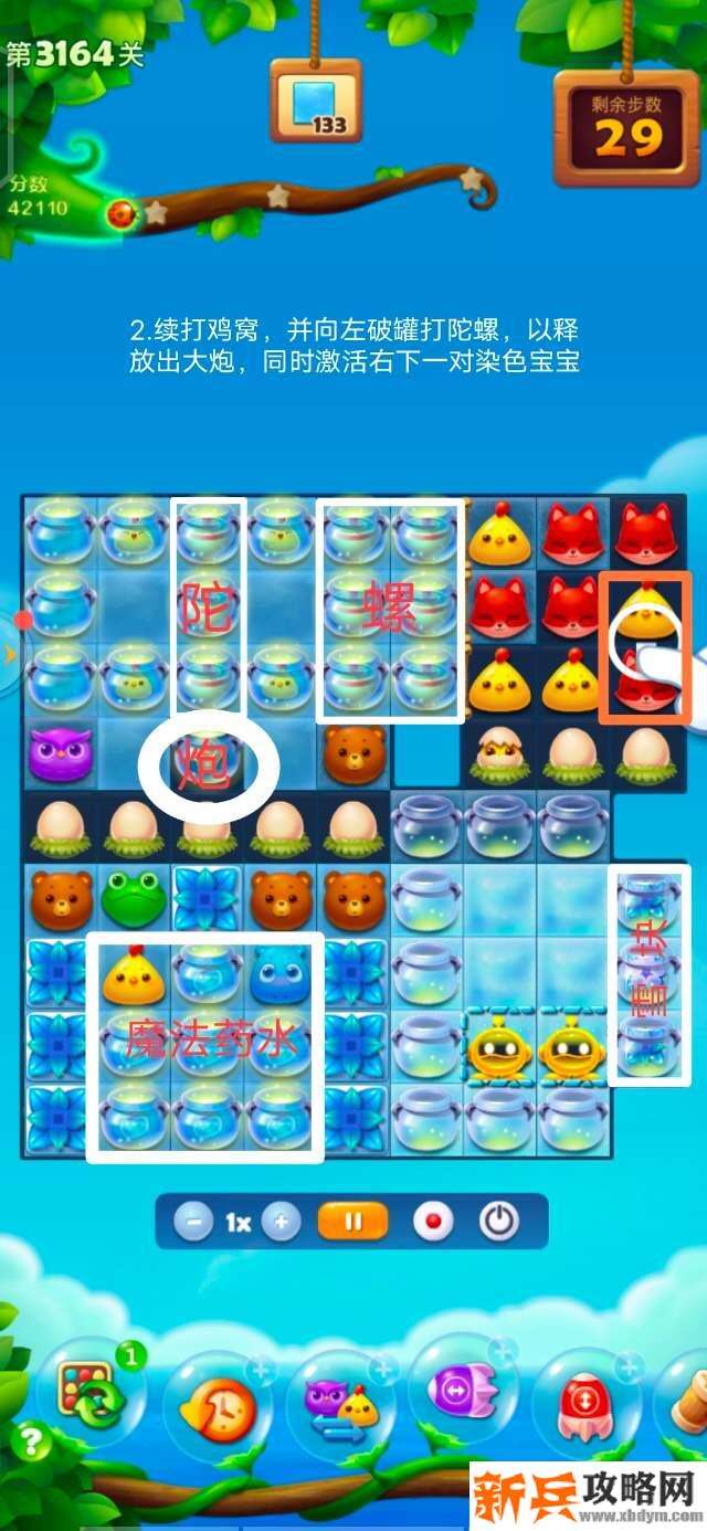 2.续打鸡窝并向左破罐打陀螺,以释放出大炮,同时激活右下区一对染色宝宝待用;
