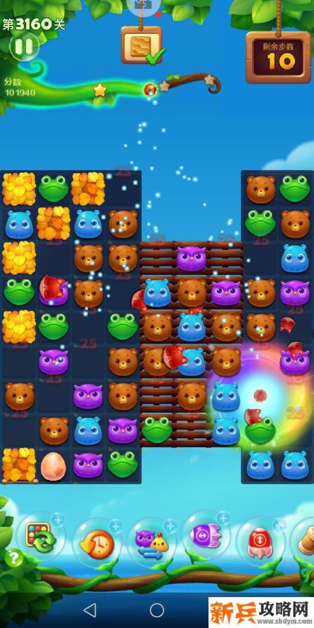 开局左下消飞机落下打右边花腃。花腃激活右面局面打开。左边树叶堆和旦旦最是谁难点打不开消不到流沙。此关三消不顺打不到全是浪费步数的。鸟十特更难组。这关没鸟炸别想过关。请村长给好运让三消顺,多组鸟炸过关。