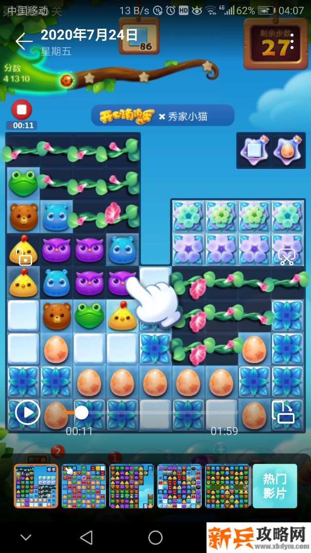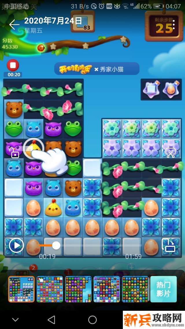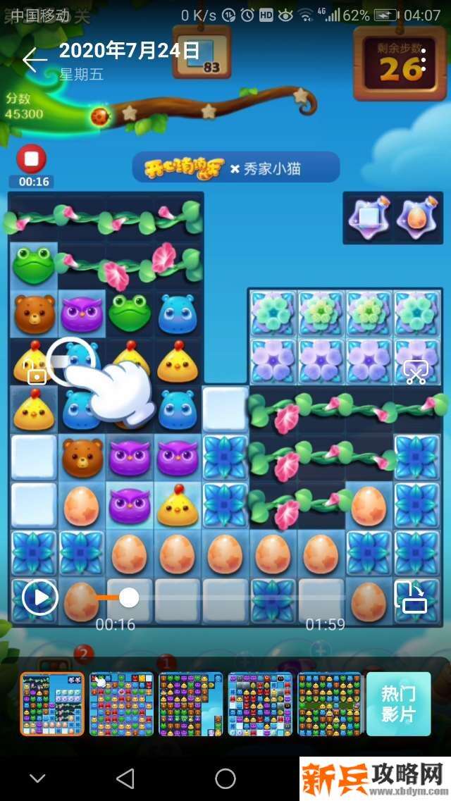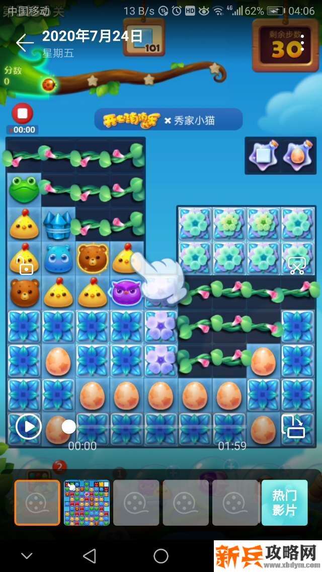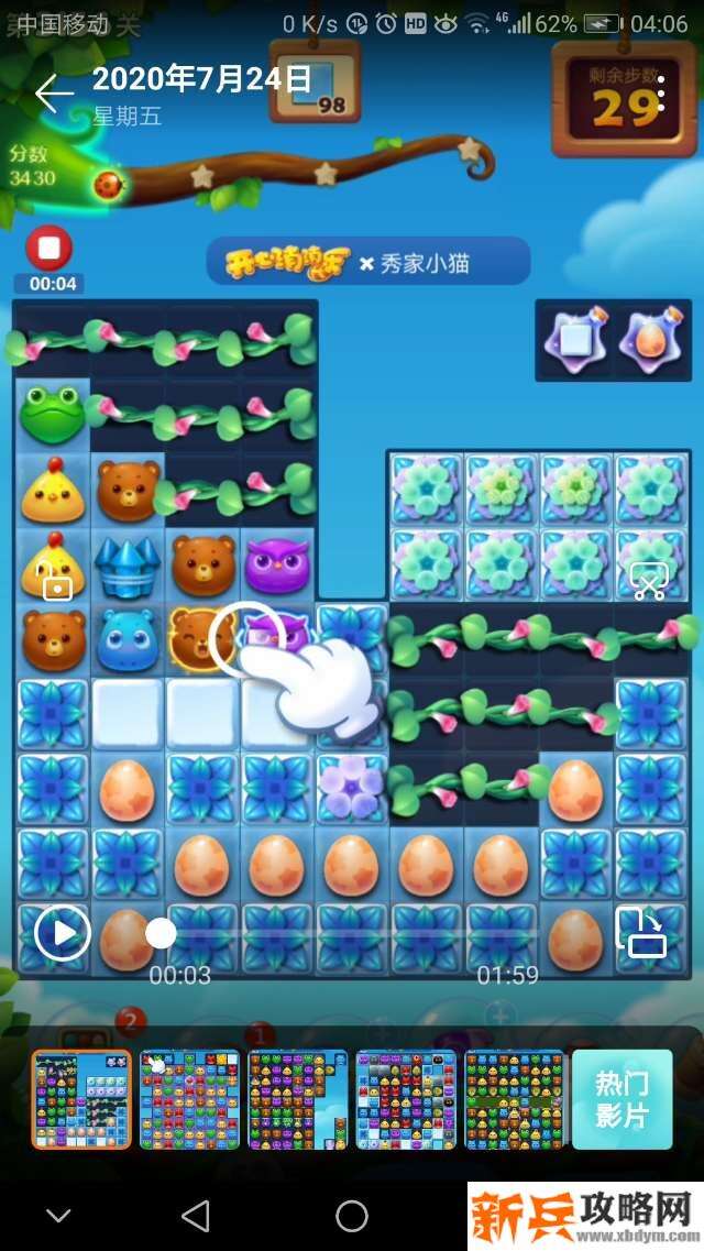 开始打左边的横三消莱蒙🐔消冰块,打爆左上角的牵牛花🌸,接着打爆右下角的彩蛋和牵牛花🌸给星星瓶充能亮了就交换!现在😊就兴大动作:三消不管用了,必须要组特效、鸟🐤十、鸟🐤单吸,还有🚀出现了也不要放过它的威力噢!