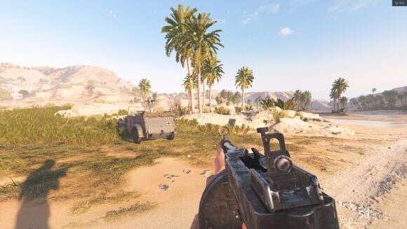 在这里的一个椰子树下,旁边有一辆军用汽车