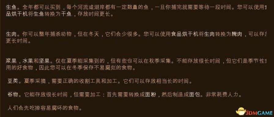 谷物:谷物是非常好的食物来源,只是需要大量的工具和人力。通过谷物的种植和加工,你可以获得稳定的赖以生存的食物来源和储备。前期尽快展开谷物的农业生产显得很有必要。