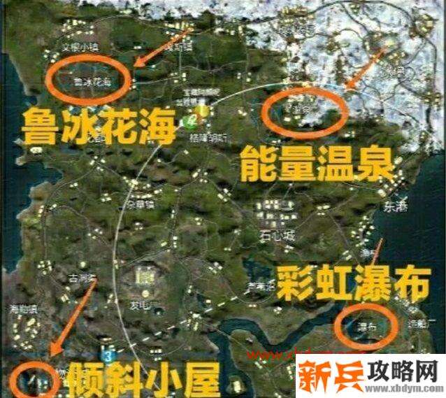 和平精英彩虹瀑布/鲁冰花海/能量温泉/倾斜小屋位置