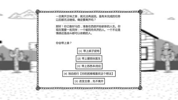 然后就可以出发了,记得选4独自出行。其实单纯为了拿困难通关成就是可以带同伴的,但是咱们是嘴炮流基本不会战斗,带不带同伴意义不大,独自出行还能装B。