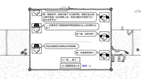 去旁边的余兴表演厅,和这个大眼对话完。找左边这个小丑对话,“关于这些。。。。额,人类。。。。”,“他。。。会眨眼吗?”,然后小丑会走开。搜索旁边的摆着彩蛋的柜子,小丑会回来。然后再用刚才的对话把小丑支开,检查彩蛋,重复三次。会发现小丑的秘密。
