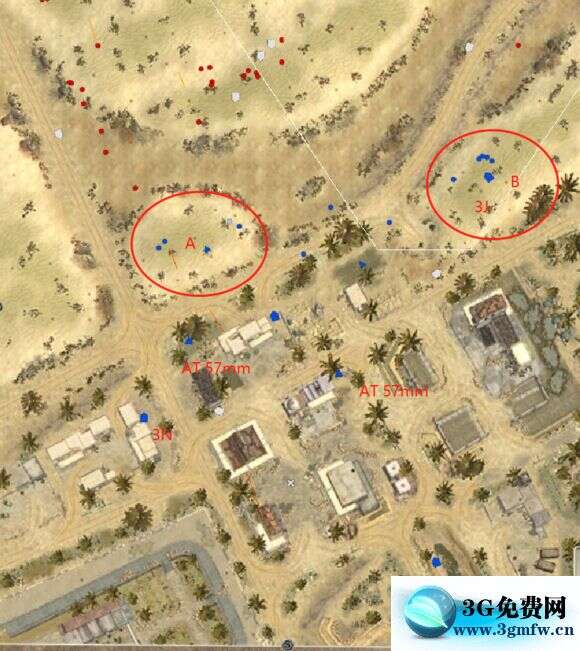因为敌我兵力差距悬殊,巷战绞肉耗不起,只能外线据敌。A和B是两个小坡,距离房区不过30多米,敌方占据后步兵一个冲锋就能重进房区打绞肉战,坦克也可以依托高地视野在坡后卖头对我方进行白嘌。相反,我方占据小坡,地方左中右三路都能获得开阔视野,居高临下,一马平川,敌人无险可守,将被我方自动火力压制,还能给后方的AT炮提供安全的环境打输出。A高地