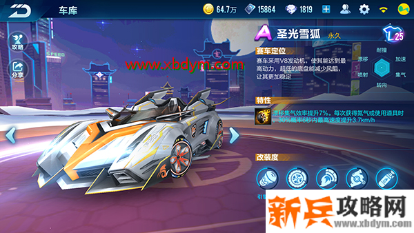 圣光雪狐使用的是V8发动机,让他能达到最高动力,超低的底盘可以减少风阻,让它更加稳定。圣光雪狐所有属性都是比较好的,没有明显缺点,是一辆非常优秀的A车。圣光雪狐车的身主要使用的是银白色喷漆,配合上金黄色线条,外加散发出亮眼的光芒,展现出这辆车的独特与高贵,车头面前的金色大V造型也尽显小狐狸的本色。
