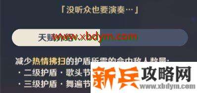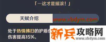 被动天赋1-没听众也要演奏.....:减少元素战技所需击中敌人个数才可触发的效果,击中两个敌人即可触发间歇性范围火元素伤害和最高护盾量,属于有胜于无的被动类型。