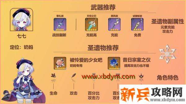 用过七七的小伙伴应该能感受到,生命值恢复量很强,所以我的理解是初期攻击力不高,用少女套提高治疗量,恢复量溢出时,可以替换成宗室增加辅助能力——提高主c攻击力。