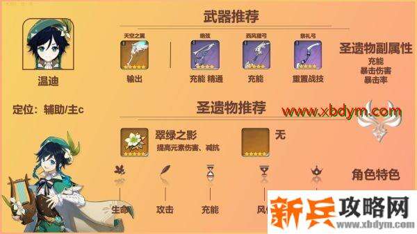 没有祭礼弓的小伙伴,可以用西风猎弓,等级高了充能也很给力,元素爆发充能快,恢复基于生命值,尽可能的提高生命值吧。