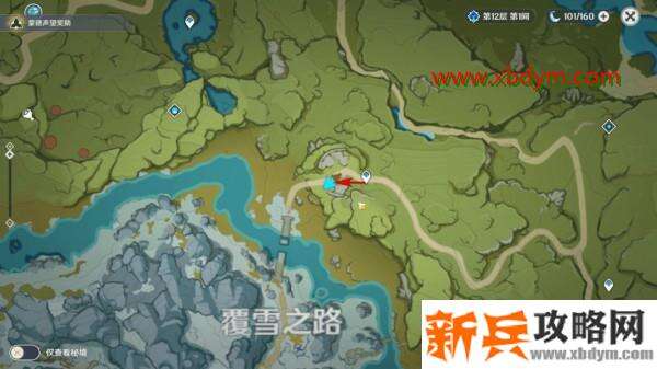 根据乔尔给出的信息,我们首先来到覆雪之路,前进路线如图所示(已经解锁了七天神像的旅行者可以直接传送到七天神像往下飞,营地就在神像下方,追踪目标会有很明显的黄色光柱,非常好找)。