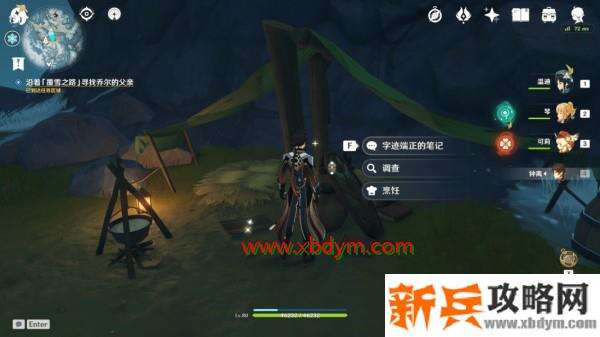 在到达任务区域后,我们可以看到雪堆下隐约露出堆积着的行李,通过火元素攻击融化掉雪堆后(普通雪堆,不需要深赤之石buff),同样是一本字迹端正的笔记。这里就是乔尔父亲探索过程中支起的第二处营地了,同时我们还可以了解到,他打算要冲击山顶,于是我们又在应急食品的建议下,继续前往山顶寻找线索。