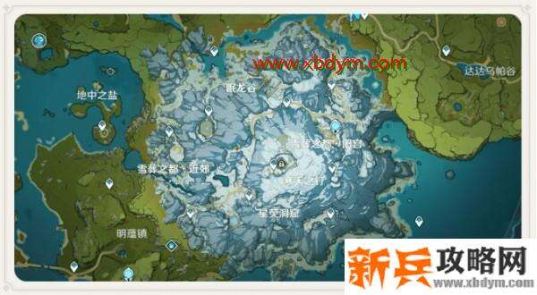 循着小地图的指引,我们来到雪山西面的山坡,前进路线如图所示,可以直接从雪山山顶的传送点飞到(尚未解锁山顶的小伙伴可以从其他位置绕路过来,追踪任务有明显的黄色光柱提示)。