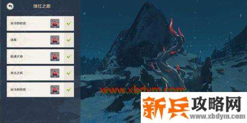 实际上,绯红之愿是玩家们将忍冬之树供奉到8级之后开启的全新玩法,将会在雪山地图上刷新出5个点位的任务,玩家们前往点位后完成挑战或者杀敌任务即可。