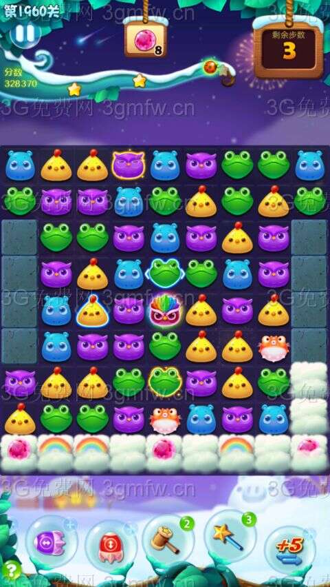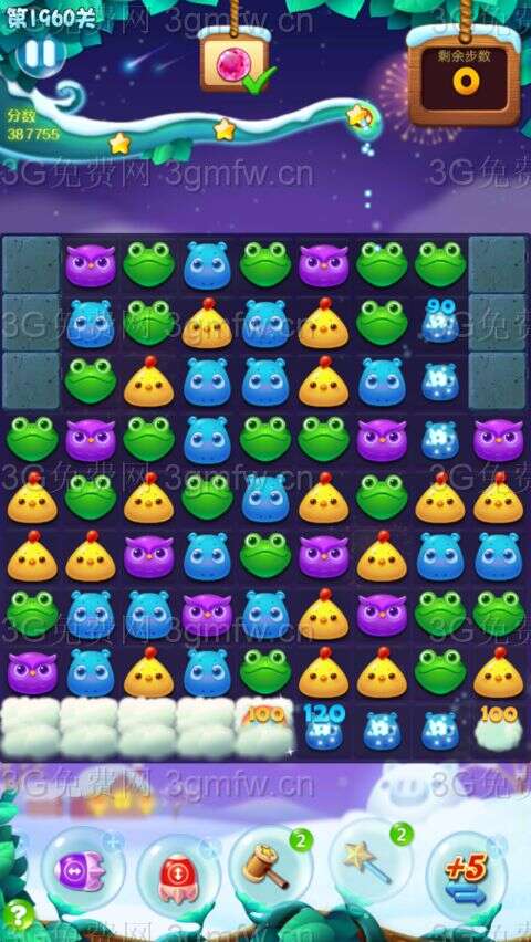 开局攻击荷苞,向下挺进,继续攻击荷苞和由此生的泡泡,其间几次鸟十,来到最后一节最后一步,差5宝石,3星分在门口,有鸟,盘算后配一棒子实现。