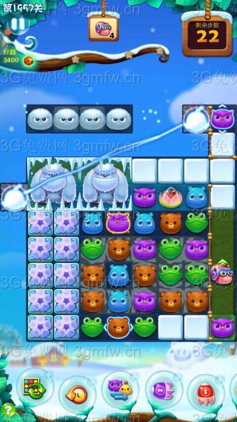 开始在右下角移动横向特效消除钥匙,右下角雪块出现缺口,两三步消除完钥匙。这关有闪电鸟花苞,连续打三次闪电鸟花苞,左上和右上角的闪电鸟斜对射,两只大雪熊释放出来。左下角的雪块组横向特效和爆炸特效消除。左上角有两门大炮和两只爆炸特效,互换爆炸特效激发大炮向下消除雪块。可以让4只窝牛一起前进,最后在终点组个爆炸特效让窝牛进入。