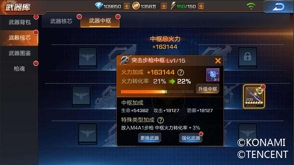 新增武器中枢功能,帮助各位魂斗罗战士安放多余武器并提供大量火力成长。武器中枢根据放置武器的总火力按比例转化为中枢火力加成。经过简单的升级,武器中枢就可达到满级,提供最大转化率;放置指定类型武器还可以提供额外转化率。