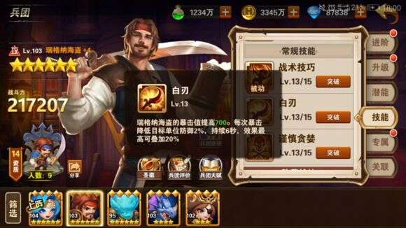 7.海盗,选择原因:老少皆宜非氪金兵团,辅助减防暴击之后可以叠加到40%之多。推荐圣辉:黑暗启迪、嫉妒