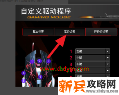 1、首先打开电脑上的鼠标驱动,打开后点击界面顶部导航栏的【高级设置】按钮。