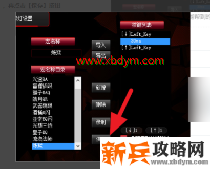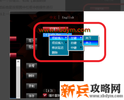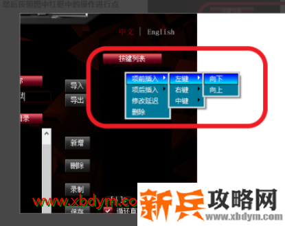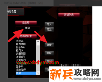 3、添加完成宏名称后,先右击【按键列表的空白处】,然后按照图中红框中的操作进行点击。
