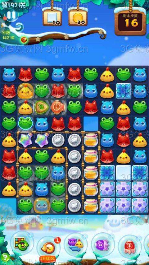 买+3步。开始在左下角打气鼓鱼花苞,花苞散开出现一串气鼓鱼,打爆一只气鼓鱼引发连爆,在右上角打破雪块,让小动物掉落右下角。激发魔法石和大炮,在蜂蜜罐顶部组竖直向下特效消除蜂蜜罐。蜂蜜出现后,组爆炸特效和直线特效互换,双精力瓶发亮。互换双精力瓶清屏消除,分数爆涨。魔法石下有花团出现,打爆花团,花团散开消除到蜂蜜。找机会组魔力鸟和小黄鸡横向特效,互换后过关了。