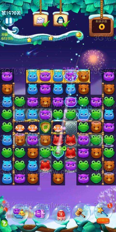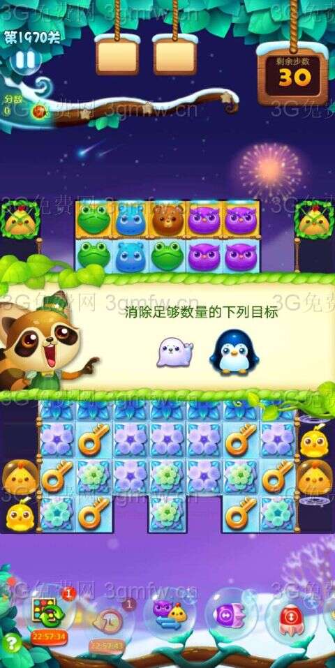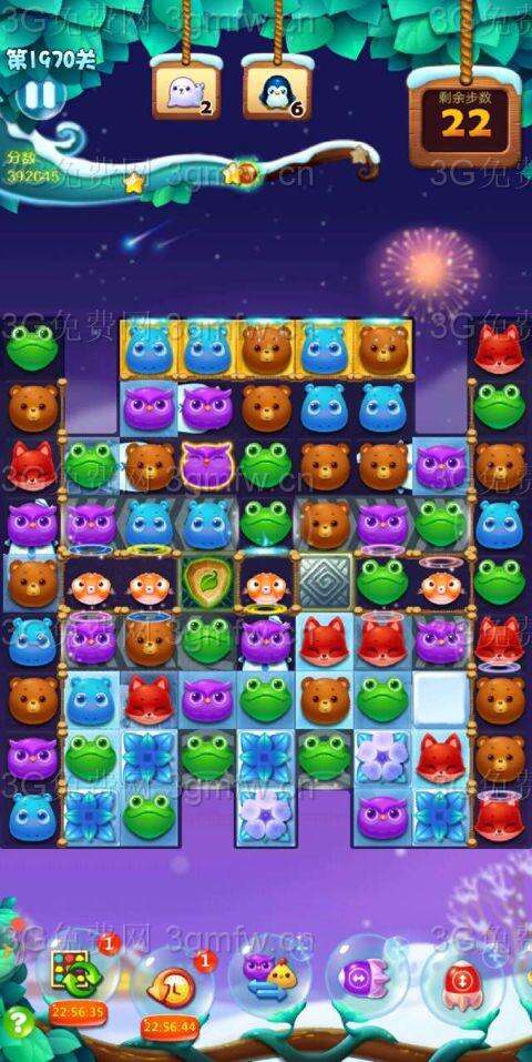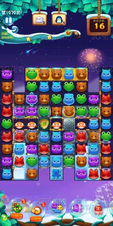 加三,猛打幽灵,两侧动物下落,闪电鸟对碰,拿钥匙,激活魔法石,打气鼓鱼,下方有合适三消或四消优先走,消了冰块,加油吧