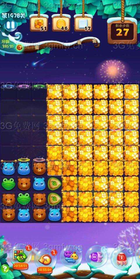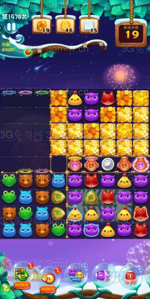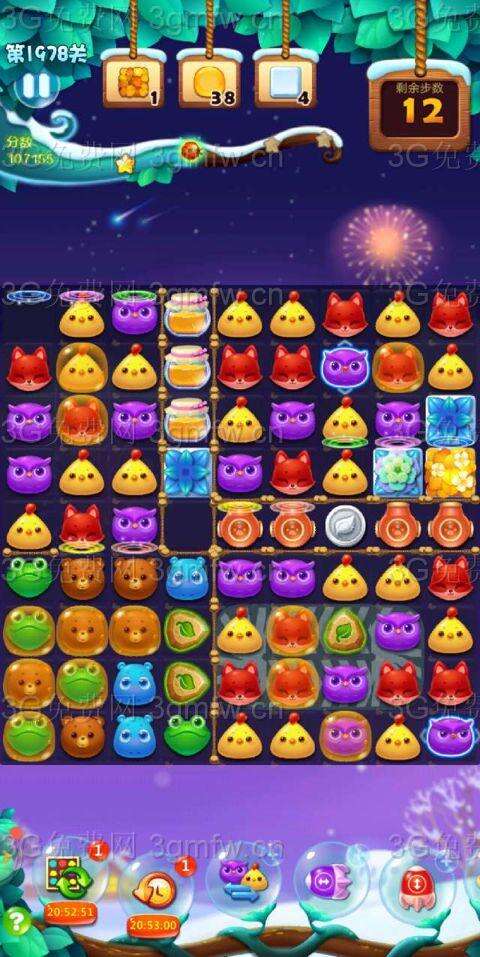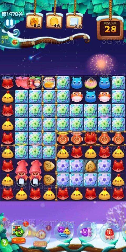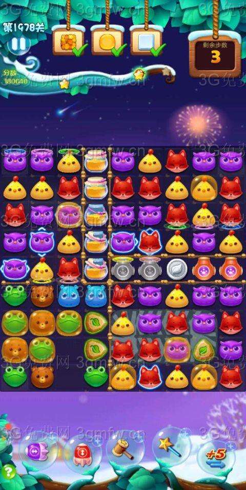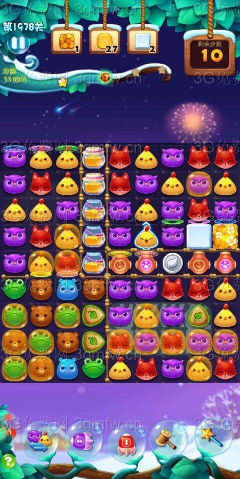 加三,打花苞,墨鱼仔发威,激活魔法石,右下角空间扩大了,再激活魔法石和打大炮,上方空间大了,关键是中间一列优先打通,蜜罐落下来,再用下方的工具和组特效来收尾,加油吧。
