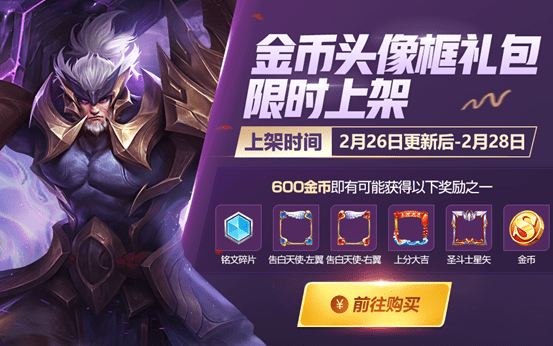 打开礼包,有机会开出告白天使-左翼、告白天使-右翼、上分大吉头像框、圣斗士星矢头像框、金币*600、铭文碎片*128/88/58其中之一。