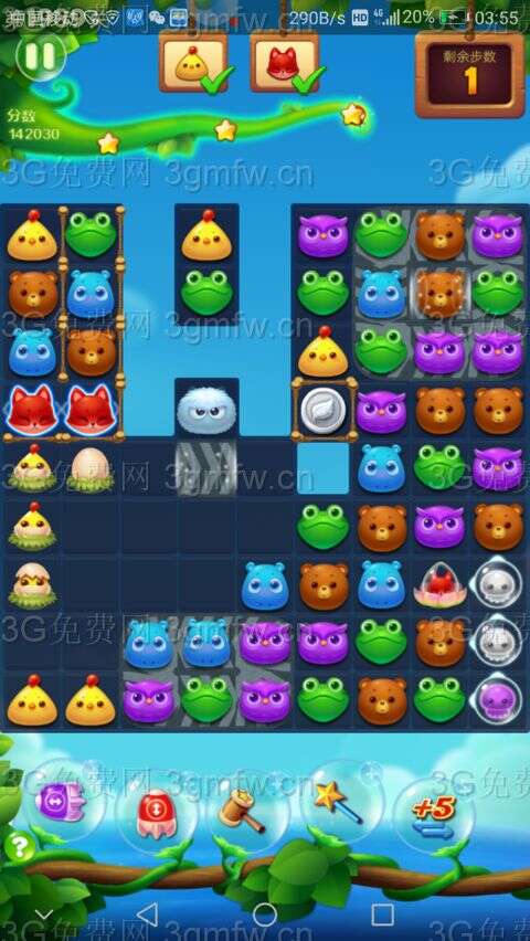 +3步,主消鸡窝,想要过关需要一定的连消或一个鸟特效,水母有机会上移一步也是不错的选择,打不到鸡窝就交换红色特效,一对染色宝宝交换要掌握时机:没有好的步数且白毛球不在场的时候换。