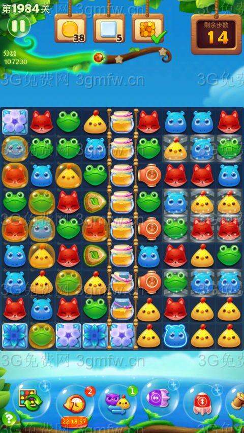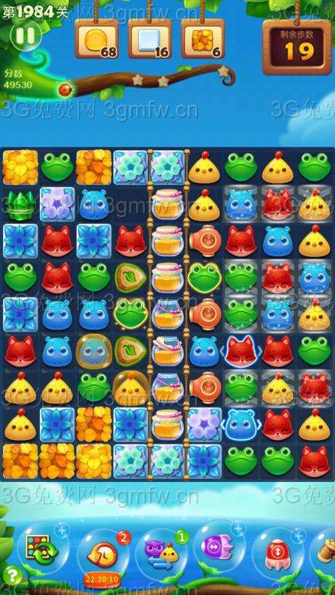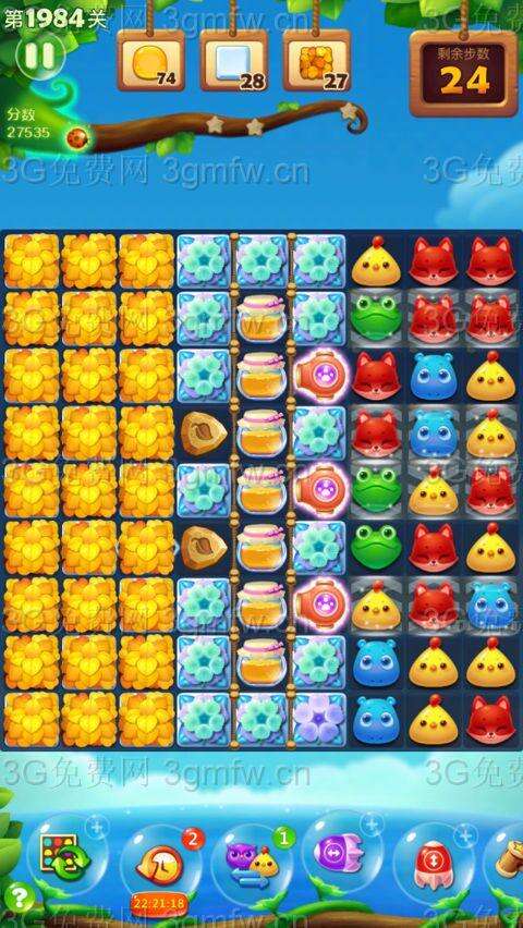 第一法宝关,开局三消暗花,换中间双鸟,后以炮,石为核心,从右向左轰,但切勿让左侧蜜糊死,注意消蜜,一定重视底部厚冰是最大难点,靠连消解决地毯,不管左右皆快速向下,底部组合横效作用大,本局现鸟配一棒子破底冰及罐,后又现鸟,单吸消蜜后,自爆3星。