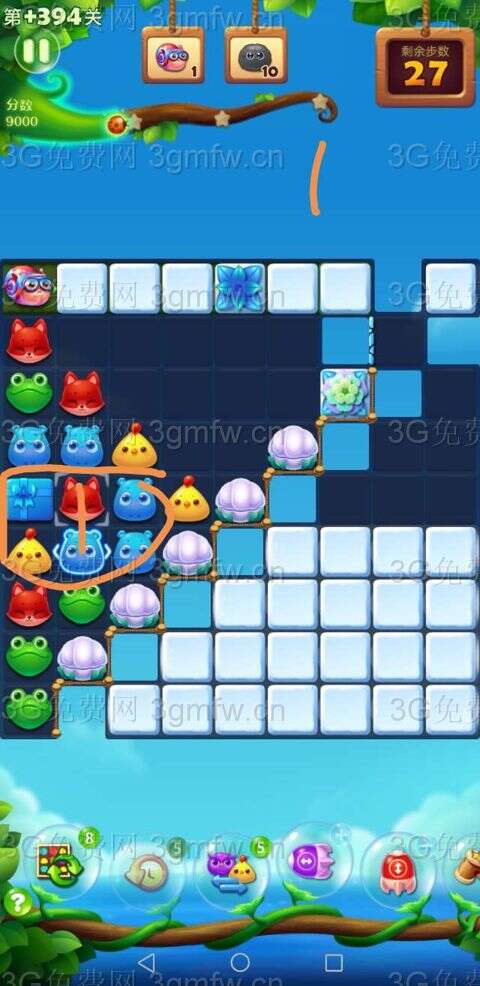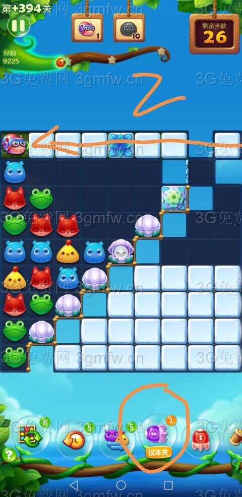 3.三消及利用特效暴打贝壳激活水母,继续暴打水母,水母特效会消除右下侧雪块。(见图3)