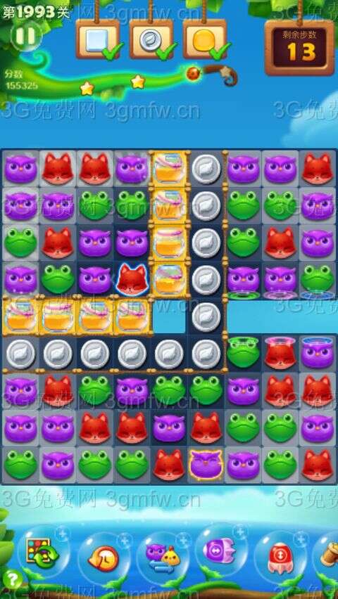 先打破蜜罐收集蜂蜜,红章鱼打下银币与,收集完解开右上角冰块与蜜罐,主打右上角收集蜂蜜,前置加3步余13步拿三星轻松过关了。