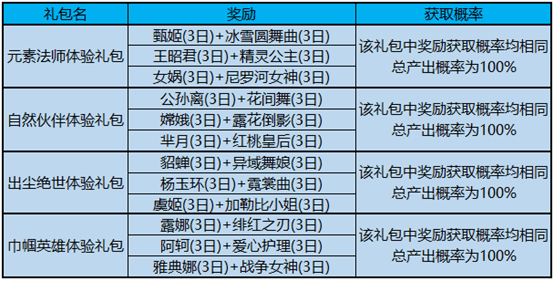 女神的祝福活动中,每个英雄体验卡的获取概率均等!