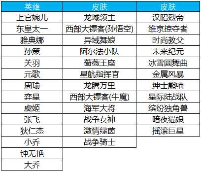 【限免名单】: 女娲、公孙离、虞姬、大乔、阿轲、貂蝉、雅典娜、花木兰、露娜、米莱狄