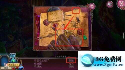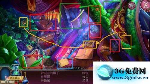 点了马车后,完成找东西的小游戏。其中比较难找的蟒是绿色的(下面有标注),还有眼镜是在地图上找到的。