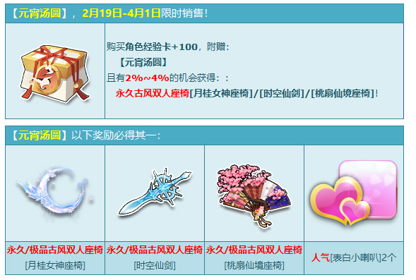 2月19日-4月1日,在商城购买【角色经验卡+100】,赠送【元宵汤圆】,开启必得以下奖励之一:古风双人座椅【月桂女神座椅】/【时空仙剑】/【桃扇仙境座椅】、表白小喇叭2个!其中核心极品期限型概率范围为:4%-6%,核心奖励永久型概率范围为:2%-4%,非核心奖励概率范围为:90%-94%。