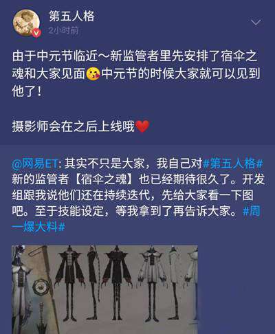 时间:2018-07-27 15:53:53 来源:本站整理 阅读:第五人格宿伞之魂又有新消息了,之前官方发声说摄影师约瑟夫会是继黄衣之主后新的监管者,不过根据最新的消息,好像上线时间有变,一起来看看吧。