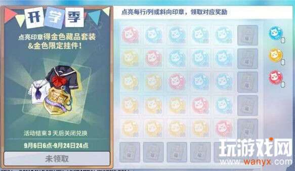 在开学季印章收集活动中,玩家收集印章,可以点亮活动印章,点亮不同行/列的印章可获得对应轴上的福袋奖励。