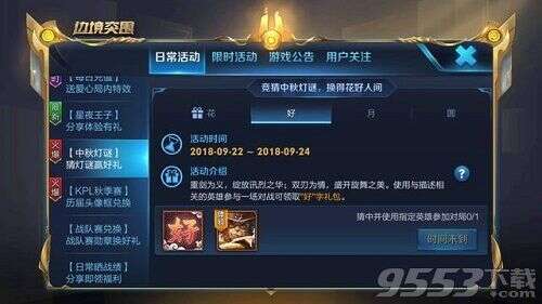 9月22日开始使用花木兰参加排位赛、5V5匹配或者吃鸡、娱乐模式即可,完成任务后记得去活动面板——日常活动——中秋灯谜换花好人间——“好”领取礼包。