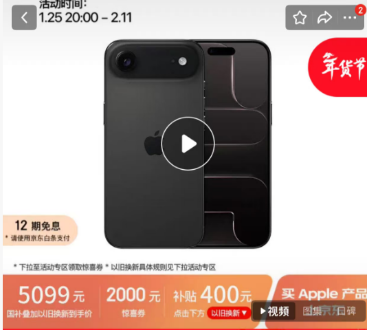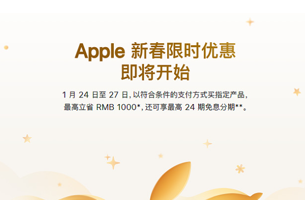 苹果2026新春优惠来了!最高立减1000元,但苹果17除外活动时间:2026年1月24日 00:01 — 1月27日 23:59个人感觉这次活动没什么新意,促销策略明显是“清库存”,因为热门的苹果17并不在优惠列表中,而1000元的优惠仅在MacBook Pro上才能使用,16系列的优惠并不大,相比其他电商平台优惠并且叠加国补后来比优惠力度并不算高,唯一的优势在于官网支持最高24期分期免息,如果你刚买了17不必为此烦恼,因为这次17不参加官网的优惠活动。目前买苹果17最便宜的价格应该是拼多多的...