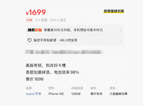 1699的美版有锁iPhone16e,A18芯片+8G运存,真的有点心动了,目前拼dd国行的价格在3200元左右,就这个价格我都觉得已经很香了,不过再瞧瞧美版有锁的价格竟然只要1700左右,这样一对比相当于直接半价了,真的是香爆了,但是如果用卡贴的话只能支持单卡,不改卡是不是也能当游戏机用?连接wifi能用也行,但是就没法带出去了,但是使用卡贴的话就怕它没事跳激活,单机使用的话在外面被罚站就尴尬了,不过好像电信卡是比较稳的,不过不管咋样这个价格对于穷果粉来说还是很有诱惑力的,即使不稳定也想试试水。...
