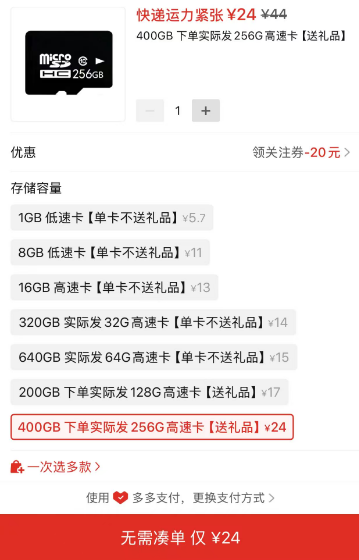 很多用户看到拼多多20几元的256G内存卡瞬间就上头了,但是这真的极不靠谱,我可以明确的告你诉这100%扩容卡,这类低价卡通过技术手段将小容量伪装成大容量,实际存储空间远小于标称值,存在数据丢失、传输卡顿,想维权?首先你得出具证明证明他是扩容卡,其次他的成本极其低,即使你申请了仅退款也没事,他可以从其他发觉不了的用户那里赚钱,所以这是一个无本万利的生意,所以还需要消费者们自己擦亮眼睛,那么有没有什么办法能防止自己买到扩容卡呢?首先看价格,扩容卡价格远低于市场价:...